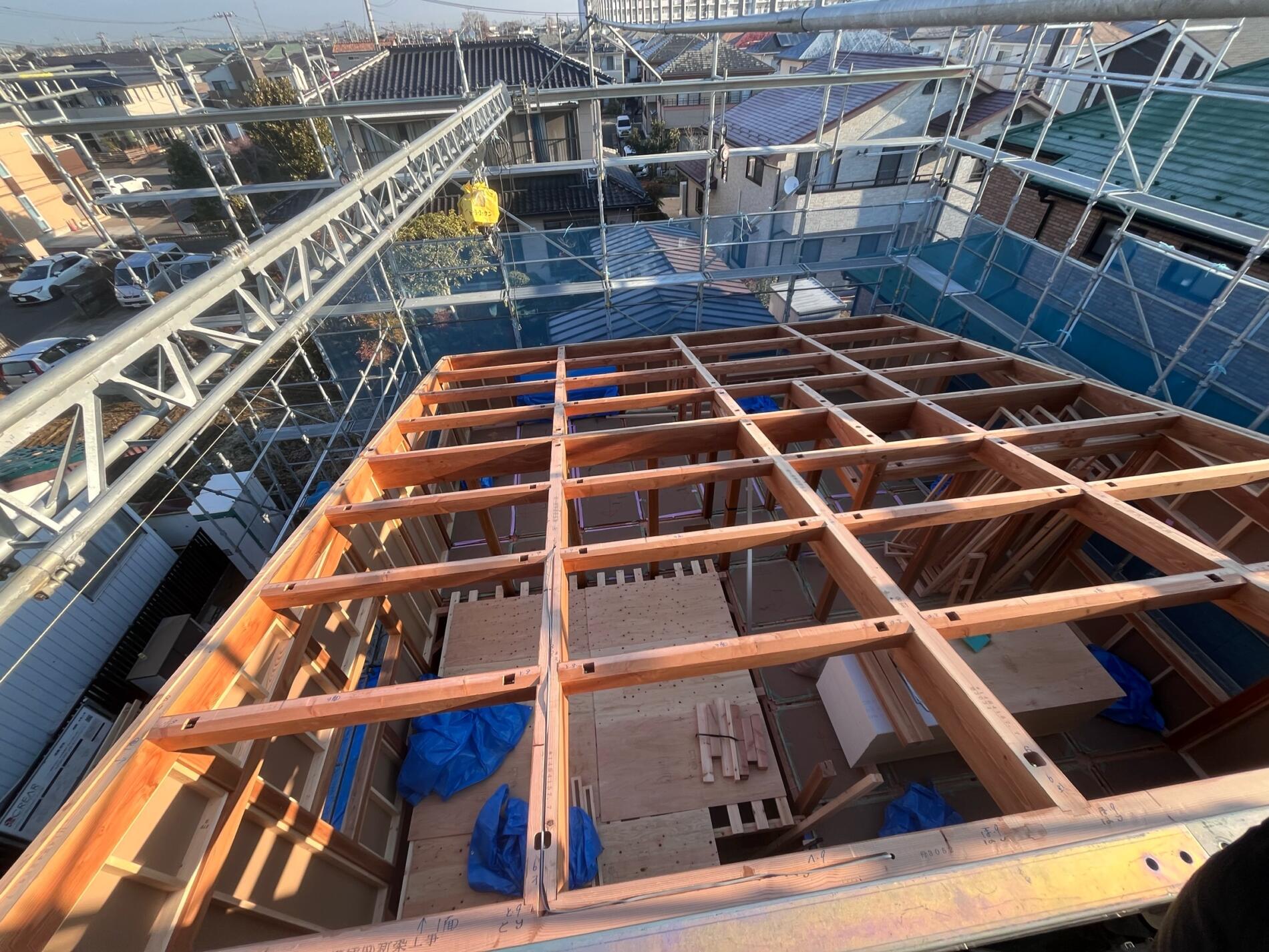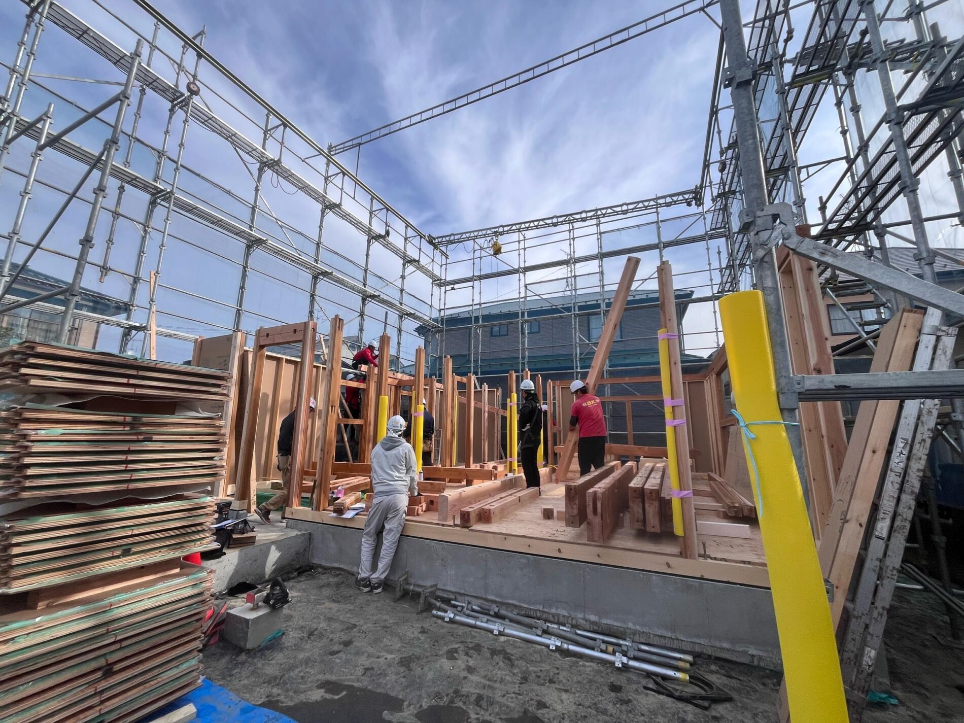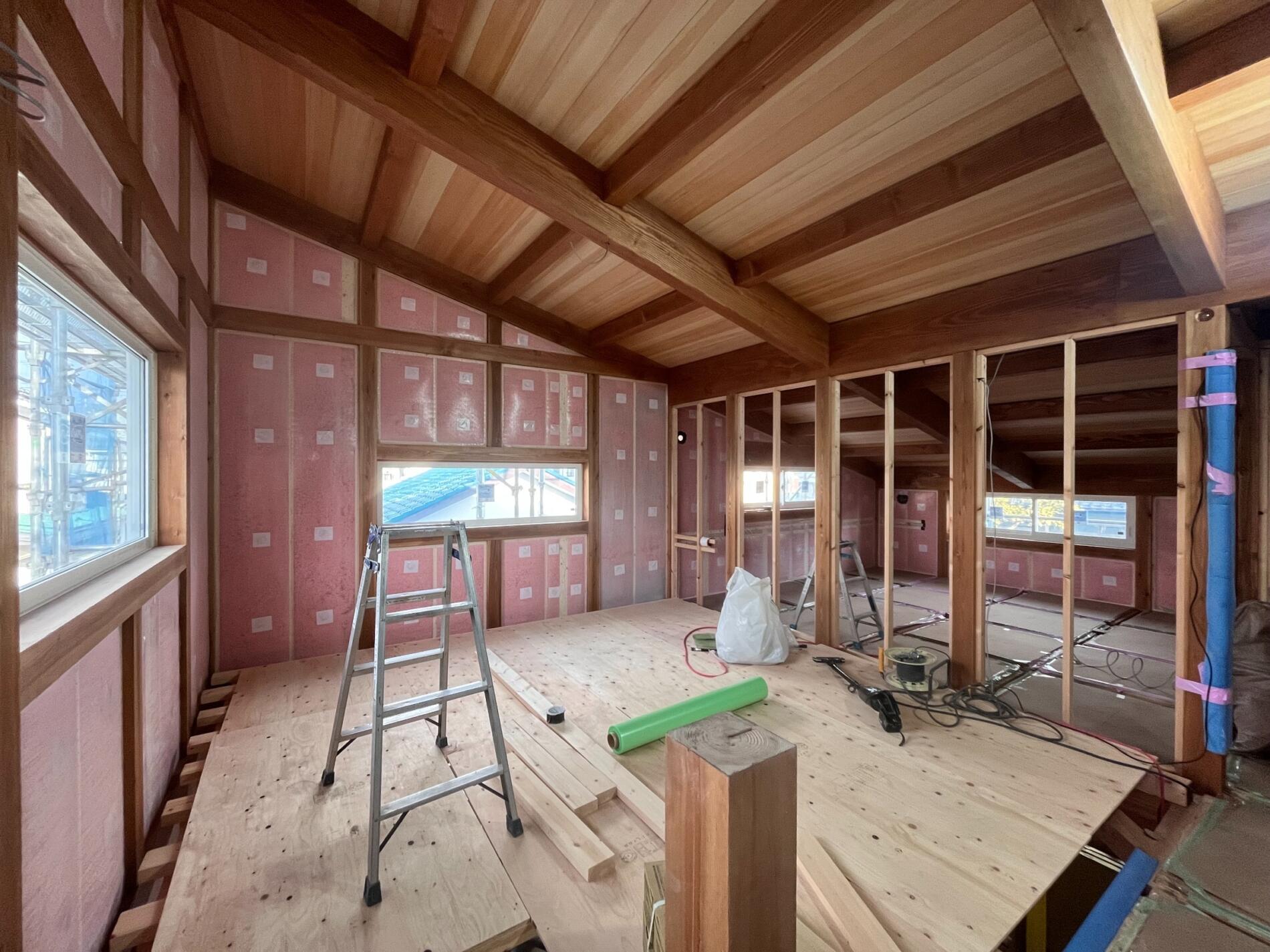 仙台市太白区 T様邸 NEW 2026年2月10日 仙台市太白区 T様邸 木に包まれたやわらかい暮らし 外観 片流れの屋根と玄関からデッキまでつながる深い軒は、デザイン性と日々の暮らしやすさを両立。 間取 キッチン背面にはすぐ使えるパントリーを設け。パウダールームとウォークインクローゼットをすぐ隣に配置、さらに抜けると洗面脱衣所があり日々の家事のストレスフリーな導線を設計。 断熱気密 外断熱+充填断熱により北海道基準クリアの建物。屋根には断熱材と遮熱シートが入っているので、夏の暑さも防いでくれます。 内装 木に包まれ心地よい室内は、白い漆喰壁に、天井の赤松の羽目板と市松模様の桐の床がアクセント!! 平面図 1F 2F 施工中 ①基礎工事 ②給排水工事 ③土台敷・床断熱 ④建て方 ⑤建て方2 ⑥屋根工事 ⑦木工事 ⑧断熱充填 ⑨漆喰仕上げ ⑩桐床仕上げ 施工後 ①リビング ②キッチン ③パウダールーム ④ウォークインクローゼット ⑤玄関 ⑥フリースペース ⑦洋室 外観 外観2 ← 仙台市太白区 M様邸 NEW
